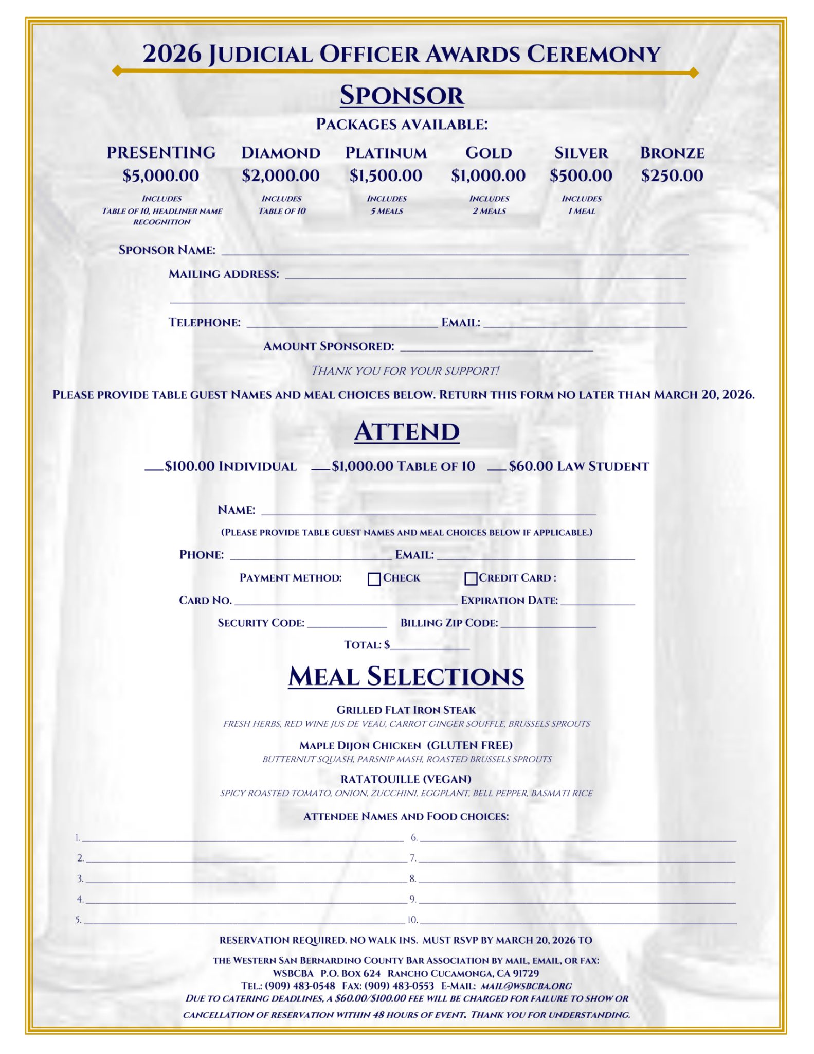 Our donors help ensure that the Bar Association will continue to thrive and provide essential services for the Inland Empire region.  Sponsors will be recognized during the event with a public “thank-you” from the podium. Sponsors will also be listed in each event email note, the event program, the Bar Bulletin newsletter, and on a board displayed at the entrance of the ballroom.
